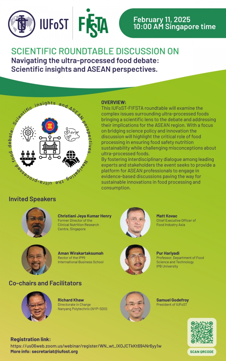 This IUFoST-FIFSTA roundtable examines the complex issues surrounding ultra-processed foods bringing a scientific lens to the debate and addressing their implications for the ASEAN region. With a focus on bridging science policy and innovation the discussion will highlight the critical role of food processing in ensuring food safety nutrition sustainability while challenging misconceptions about ultra-processed foods. By fostering interdisciplinary dialogue among leading experts and stakeholders the event seeks to provide a platform for ASEAN professionals to engage in evidence-based discussions paving the way for sustainable innovations in food processing and consumption.