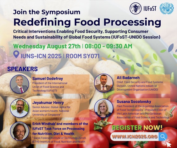The International Union of Food Science and Technology (IUFoST), in collaboration with the United Nations Industrial Development Organization (UNIDO), invites you to a symposium titled “Redefining Food Processing – Critical Interventions Enabling Food Security, Supporting Consumer Needs and Sustainability of Global Food Systems.” This will take place on 27 August 2025, 08:00 - 09:30 AM, at IUNS‑ICN 2025, Room SY071.